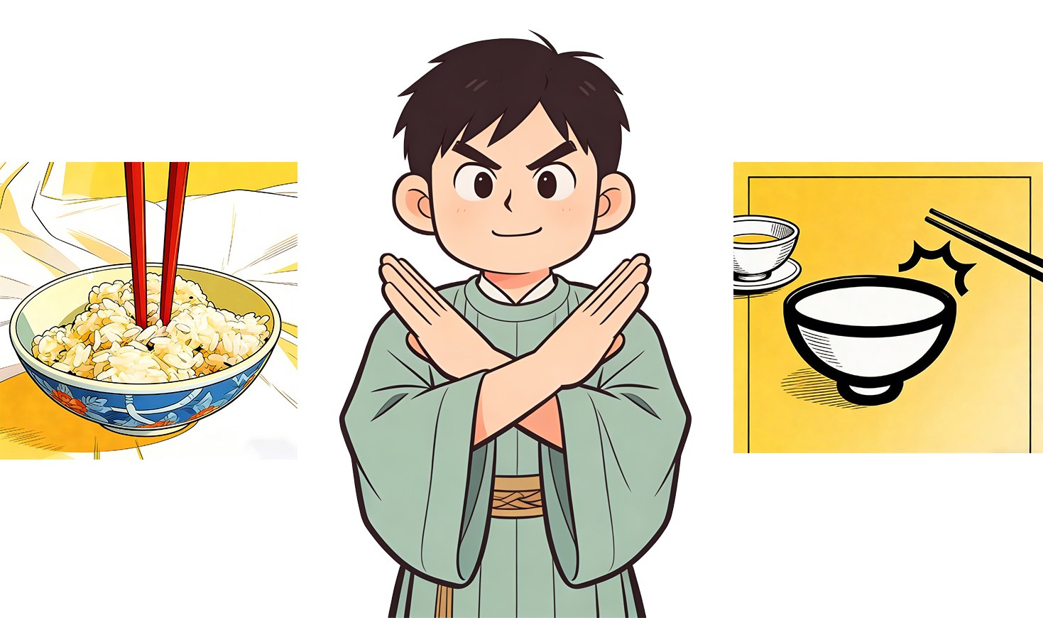 Per indicare che hai finito di mangiare, puoi posizionare ordinatamente le bacchette sulla parte superiore della ciotola o del piatto.
