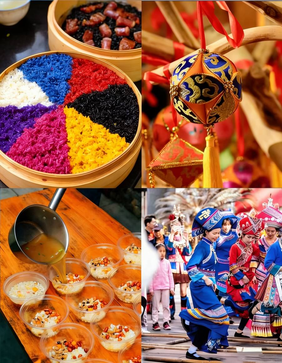 Oltre a cantare, le persone festeggiano preparando riso glutinoso a cinque colori tinto con succhi vegetali, lanciando palline ricamate, ballando la pole dance di bambù e suonando tamburi di bronzo.